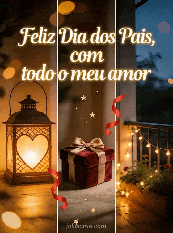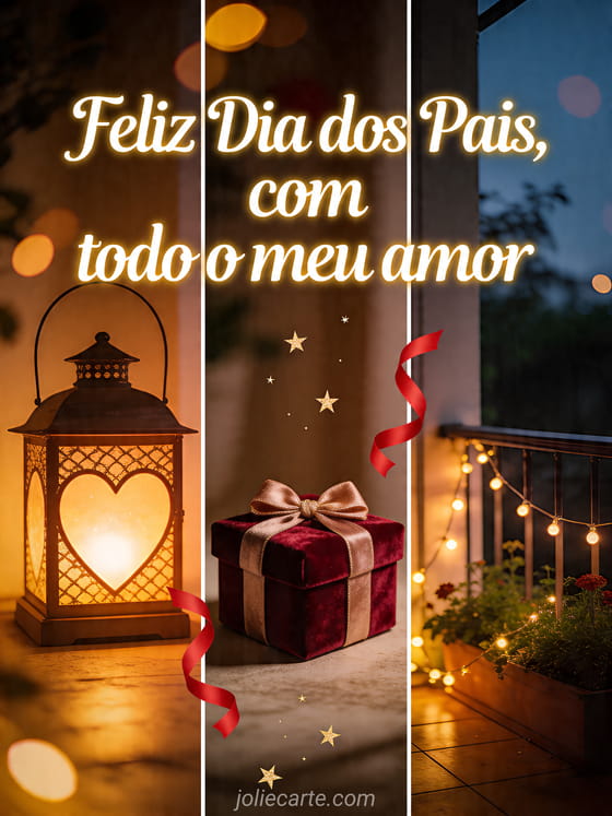 Envie um texto de amor de Dia dos Pais em escrita elegante marfim com contorno luminoso, em uma colagem calorosa com uma lanterna em forma de coração, caixa de presente de veludo e jardim tranquilo na varanda brilhando sob luzes de fada. Você também pode descobrir um cartão gravata Dia dos Pais, felicidades dia dos pais ou feliz Dia dos Pais papai cartão.