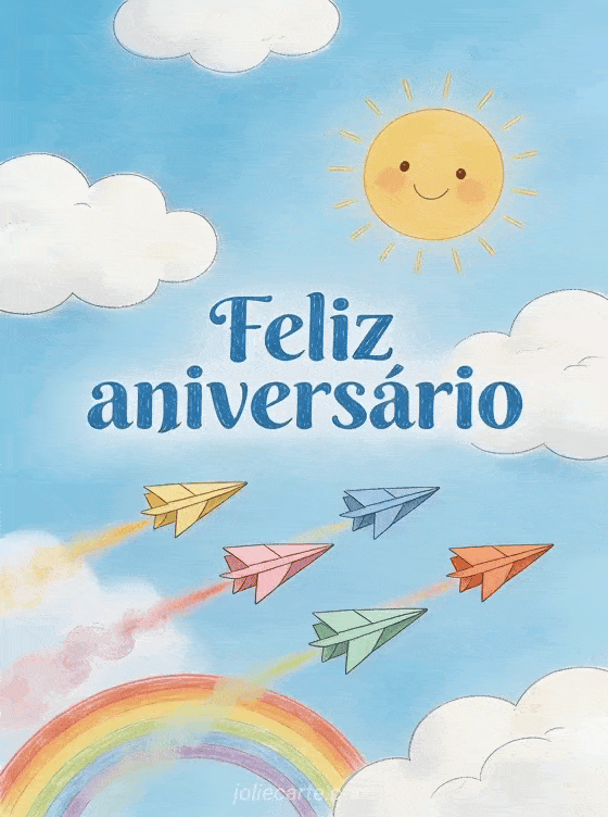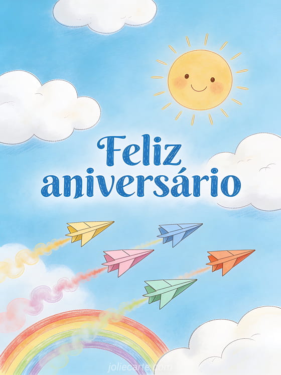 Envie um texto alegre de aniversário para seu neto com aviões de papel coloridos voando em formação por um céu azul, rastros de fumaça em arco-íris e nuvens brancas suaves. Veja também votos de aniversário para meu neto, riso sem alegria ou aniversário neto.