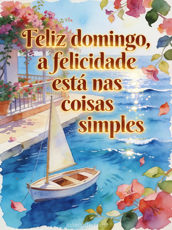 Compartilhe um pensamento luminoso de domingo com letras castanhas, um pequeno veleiro sobre água azul, um terraço coberto de buganvília e sol brilhando nas ondas. Veja também uma feliz domingo cachorros imagem, um feliz domingo cartão virtual animado ou um domingo beijos gif.