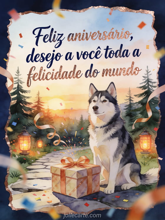 Envie uma mensagem de aniversário emocionante com um husky orgulhoso ao lado de um presente embrulhado em um jardim de pinheiros ao nascer do sol. Fitas, confetes brilhantes e lanternas acesas criam uma cena acolhedora para desejar toda a felicidade do mundo. Veja também um poema para o aniversário do meu filho, um poema de aniversário para meu filho ou um poema de aniversário para meu filho.