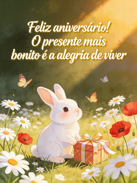Envie um terno desejo de aniversário com este doce cartão com um pequeno coelho branco em um campo florido com margaridas, papoulas, borboletas e um presente embrulhado. Descubra também mensagem feliz aniversário simpática, frase original aniversário e cartão de aniversário virtual original grátis.