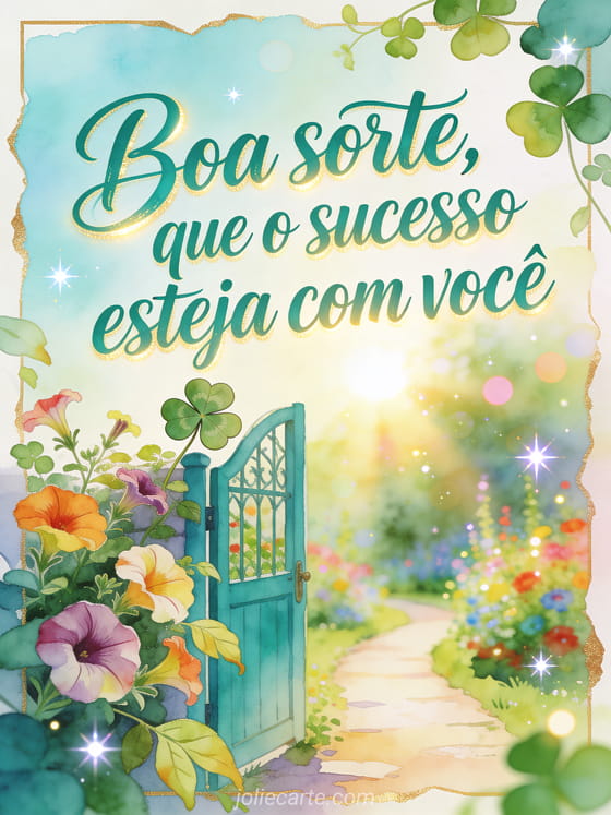 Deseje boa sorte com uma mensagem esmeralda, um trevo de quatro folhas, um portão de jardim aberto e petúnias ao longo de um caminho ensolarado. Veja também boa sorte na sua prova imagem, cartão boa sorte para prova ou texto boa sorte novo trabalho.