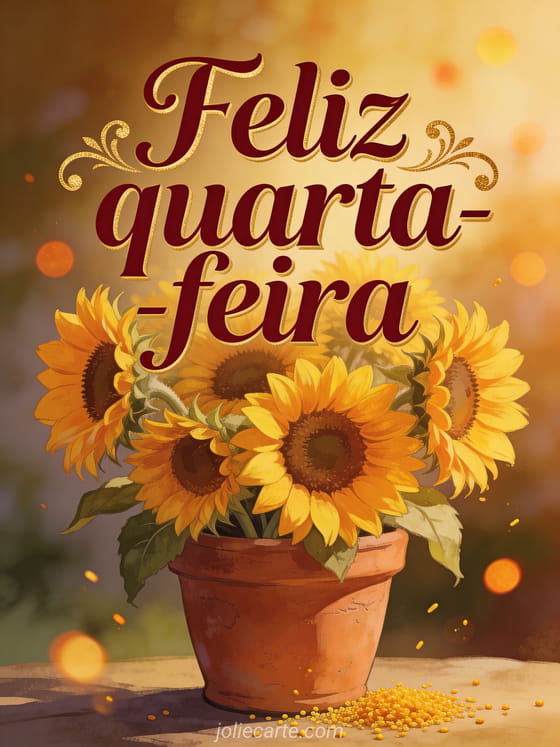 Envie uma saudação calorosa de feliz quarta-feira com girassóis em um vaso rústico de terracota, luz dourada de verão e charme suave do campo. Veja também feliz quarta-feira com animais, imagem animada feliz quarta-feira ou bom dia tenha um bom dia bom dia de quarta-feira.
