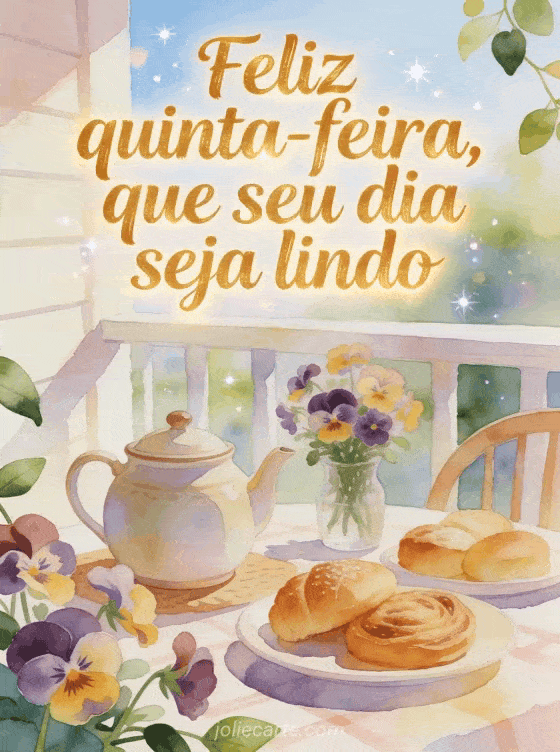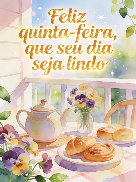 Deseje feliz quinta-feira e um dia lindo com um café acolhedor na varanda, um bule de cerâmica, doces frescos e flores de amor-perfeito sob luz brilhante da manhã. Compartilhe este cartão benevolente e descubra também feliz quinta-feira beijos gifs, feliz quinta-feira gif animado ou feliz quinta-feira imagens de corações.