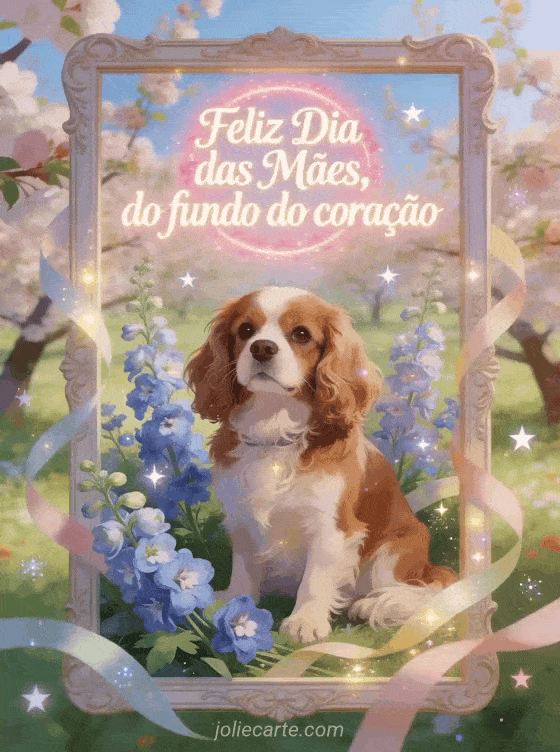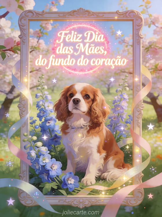 Compartilhe um texto sobre o Dia das Mães com letras marfim luminosas, halo rosado e uma ilustração vibrante de pomar. Um cachorro Cavalier King Charles fica entre delfínios frescos e fitas ao vento neste cartão caloroso do fundo do coração. Veja também mensagens do Dia das Mães, fotografia para o Dia das Mães ou um desenho para o Dia das Mães.