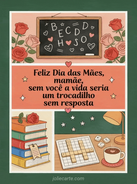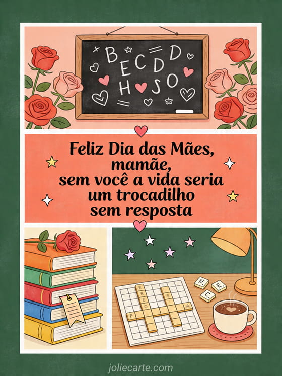 Compartilhe uma colagem bem-humorada de Dia das Mães com quadro-negro, livros, rosas, palavras cruzadas, chocolate quente e letras soltas. Você também pode enviar feliz Dia das Mães minha nora, feliz Dia das Mães ou Dia das Mães.