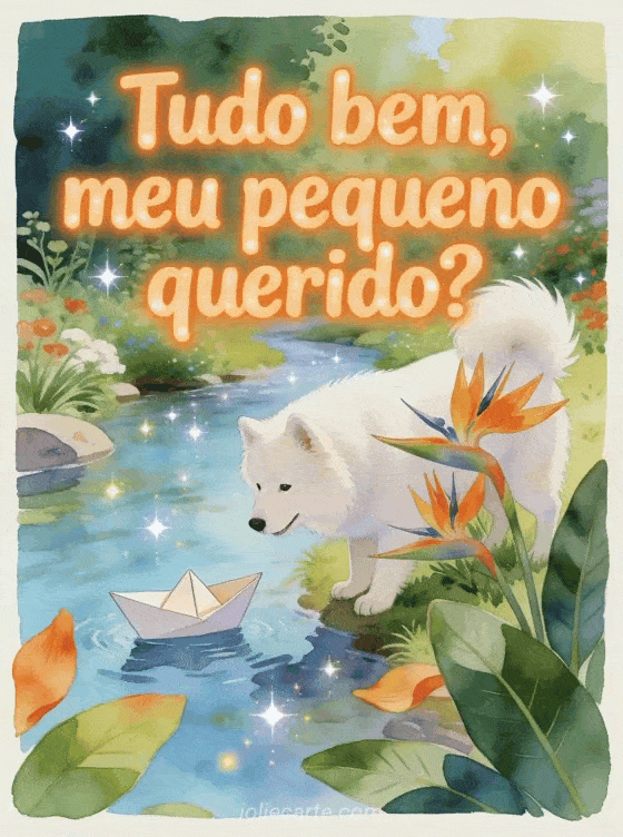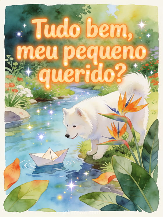 Pergunte com carinho brincalhão por meio de letras laranja, flores ave-do-paraíso, um cachorro Samoieda junto a um barco de papel dobrado e um riacho de jardim brilhante. Veja também um bom dia meu amor como você está esta manhã, um cartão de sim estou bem minha querida ou uma saudação de como está minha filha.