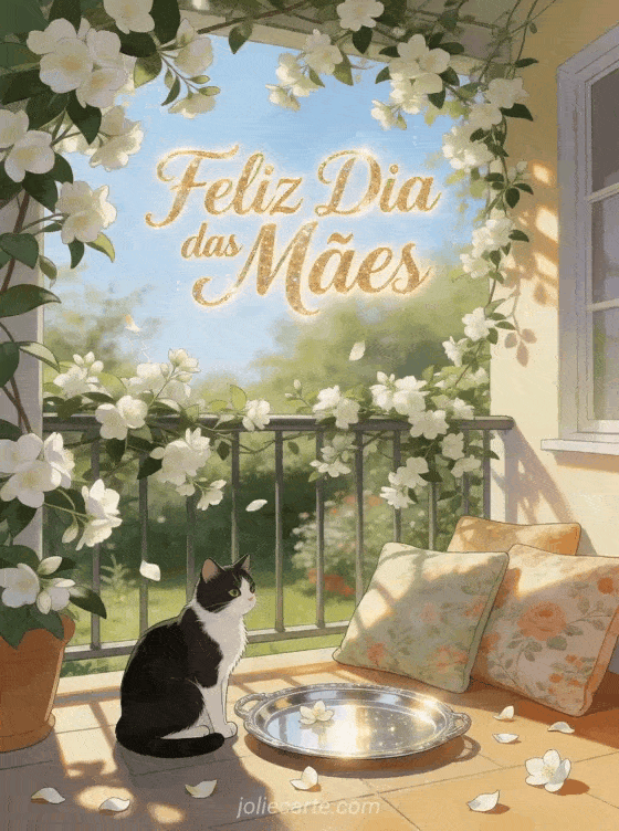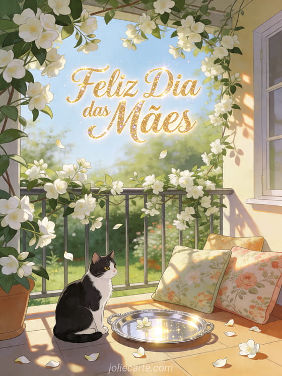 Compartilhe um desenho para o Dia das Mães com letras champanhe luminosas, brilho suave e uma varanda coberta de jasmim. Um gato preto e branco fica ao lado de uma bandeja de café prateada e almofadas de jardim ao sol, criando um cartão caloroso. Veja também feliz Dia das Mães cartão, fotografias do Dia das Mães ou mensagens para o Dia das Mães.