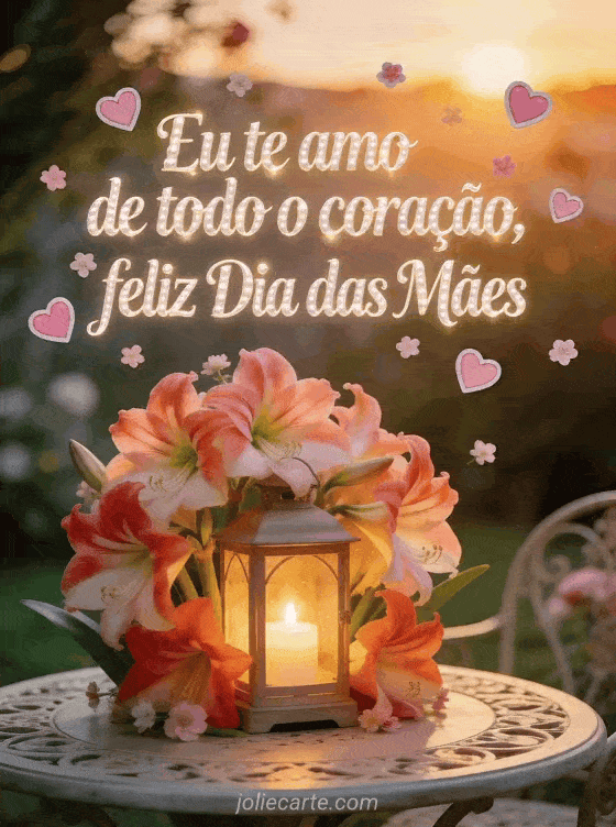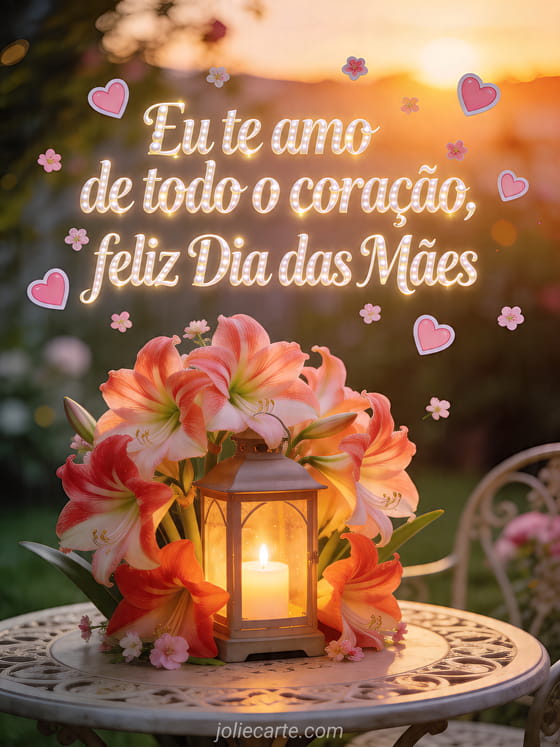 Compartilhe um poema de amor para o Dia das Mães com caligrafia perolada, corações rosados, pequenas flores e amarílis ao redor de uma lanterna com vela sobre uma mesa de jardim. Este cartão diz eu te amo de todo o coração. Veja também feliz Dia das Mães, feliz Dia das Mães mamãe querida ou poesia sobre o Dia das Mães.