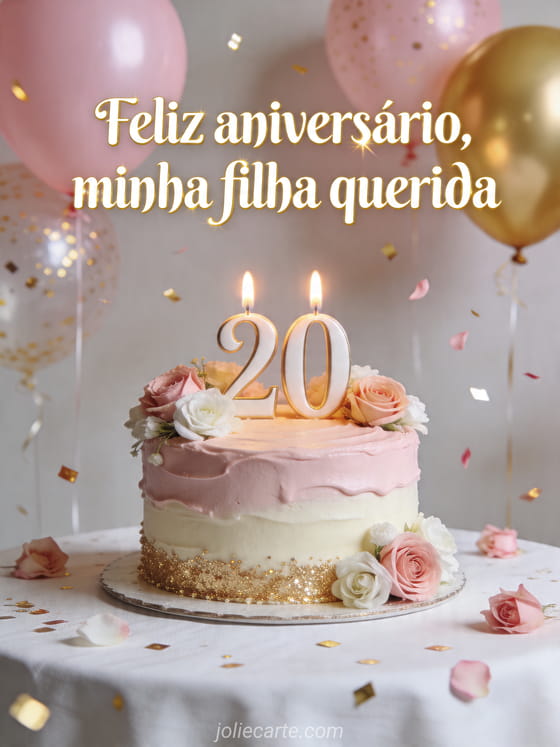 Celebre sua filha com este delicado cartão de aniversário com um elegante bolo com velas, balões rosa e dourados e confetes brilhantes. Você também pode ver poema para minha filha aniversário, pequeno poema de aniversário para minha filha ou poema para aniversário para minha filha.
