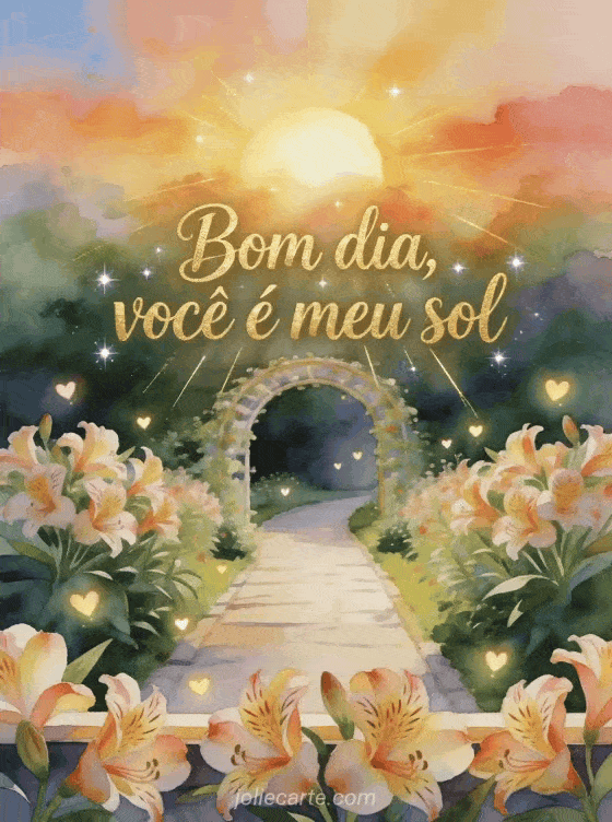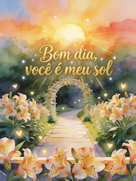 Envie uma mensagem romântica de bom dia para minha namorada com letras douradas radiantes em aquarela, um nascer do sol luminoso, um caminho arqueado de jardim, alstroemérias e pequenos corações de luz flutuando. Veja também cartões de bom dia gratuitos, mensagem bom dia imagem ou cartões de bom dia para amigos.