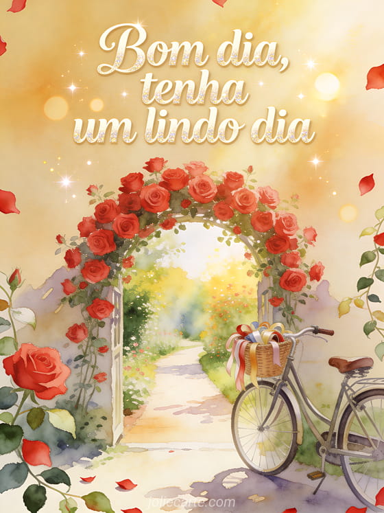 Envie uma mensagem de bom dia com um cartão ensolarado que se abre para um jardim de rosas, perfeito para desejar um lindo dia. Você também pode compartilhar uma bela mensagem de bom dia, um olá ou um cartão de bom dia animais.