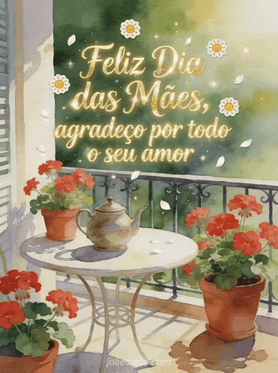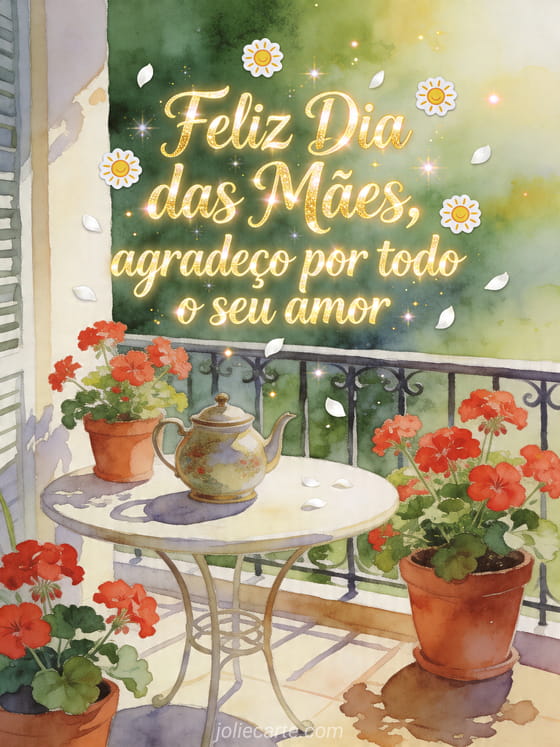 Compartilhe um agradecimento luminoso de Dia das Mães com um cartão em aquarela cheio de gerânios vermelhos, luz de primavera e uma varanda acolhedora. Veja também votos de Dia das Mães, um desenho do Dia das Mães ou fotos para o Dia das Mães.