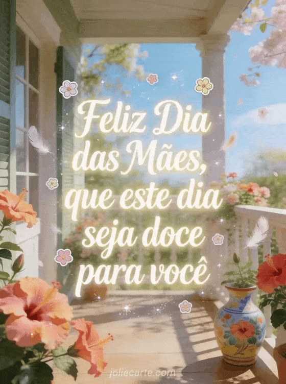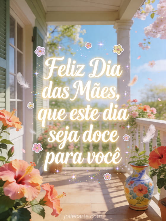 Compartilhe uma mensagem luminosa de Dia das Mães com uma varanda arejada, flores de hibisco, um vaso de cerâmica pintado e penas suaves flutuando. Veja também flor para o Dia das Mães, citação Dia das Mães ou feliz Dia das Mães sogra.