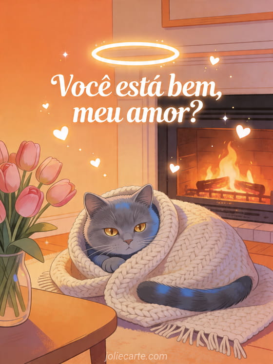 Compartilhe uma doce mensagem de amor com uma lareira aconchegante, um suave gato chartreux e pequenos corações luminosos. Veja também como você está meu amor sms, oi como você está e oi como você está.