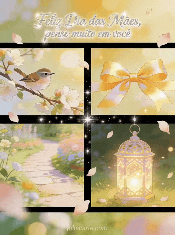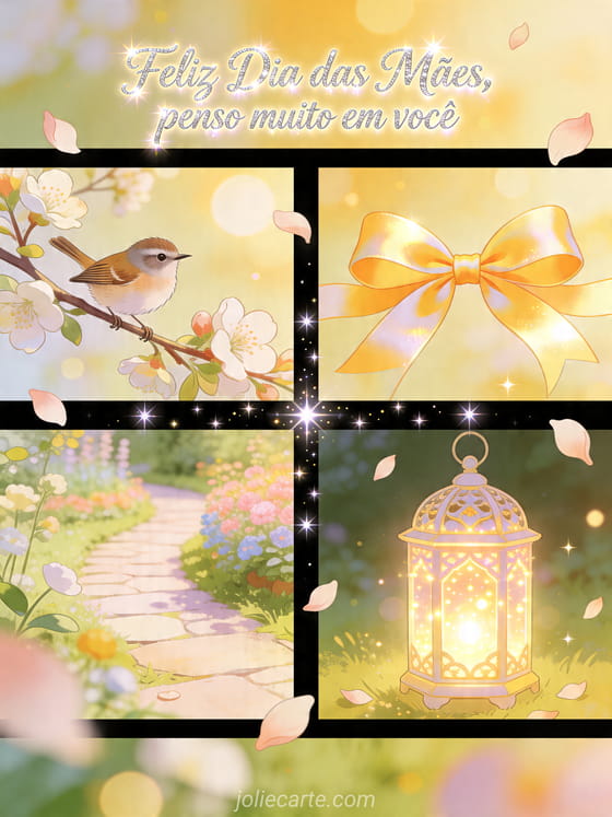 Compartilhe votos de Dia das Mães em um cartão ilustrado de quatro painéis com uma pequena corruíra, galhos floridos, um laço de fita, um caminho de jardim e uma lanterna luminosa. Veja também desenho do Dia das Mães, fotos para o Dia das Mães ou imagens do Dia das Mães.