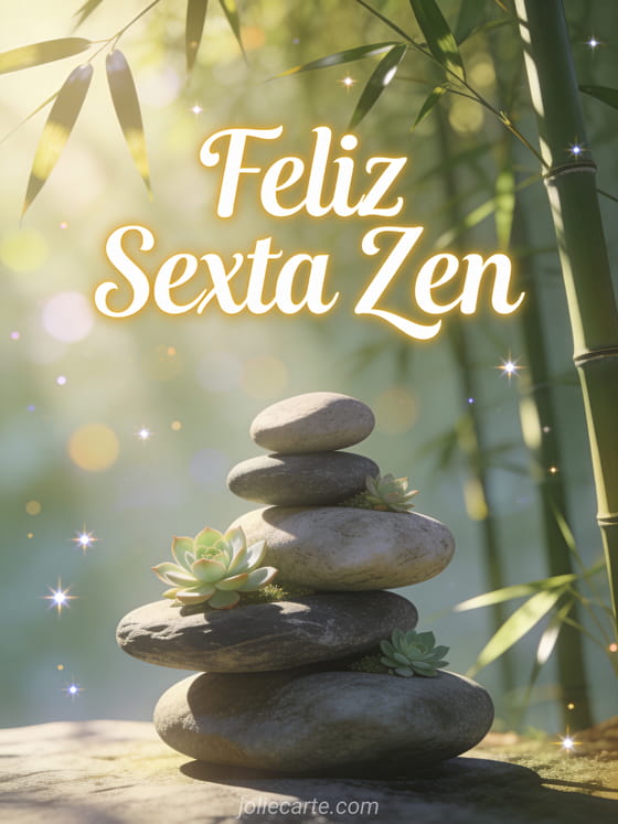 Envie uma serena saudação de feliz sexta zen para trazer calma e equilíbrio ao dia de alguém especial. Uma bela composição de pedras lisas e bambu em suave luz matinal. Descubra também um cartão feliz sexta e bom fim de semana ou um gif de sexta com humor.