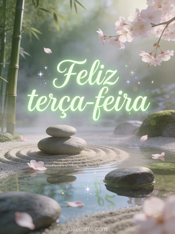 Envie uma mensagem tranquila de feliz terça-feira com pedras lisas, flores de cerejeira flutuando, bambu e um brilho suave verde sálvia. Veja também uma passar uma feliz terça-feira, um feliz terça-feira e tenha um bom dia gif ou uma feliz terça-feira beijinhos imagens.