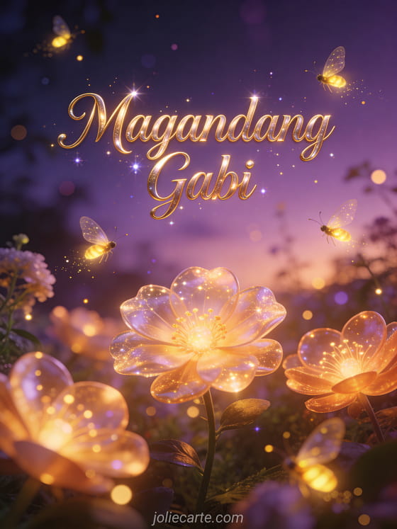 Magpadala ng mahiwagang magandang gabi na bati gamit ang kahanga-hangang card na ito. Isang hardin sa takipsilim na kumikinang na may mga alitaptap at luminescent na bulaklak sa mainit na amber at malalim na lila na atmospera. Tuklasin din ang zen na gabi na card o ang magandang gabi na card.