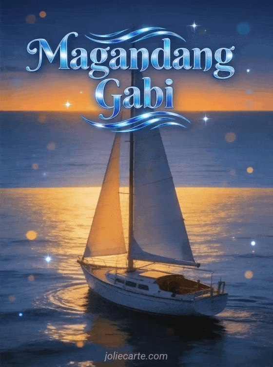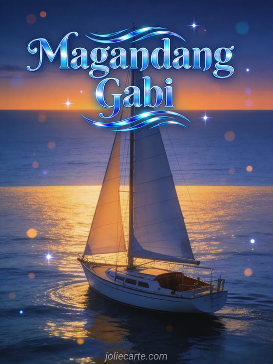 Magpadala ng mapayapang magandang gabi na bati gamit ang magandang card na ito. Isang eleganteng bangkang layag na dumadausdos sa tahimik na dagat sa takipsilim na may gintong abot-tanaw sa mapayapang maritimong atmospera. Tuklasin din ang mahiwagang gabi na card o ang zen na gabi na card.