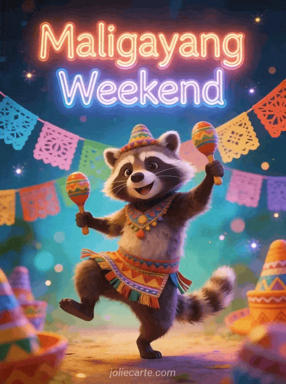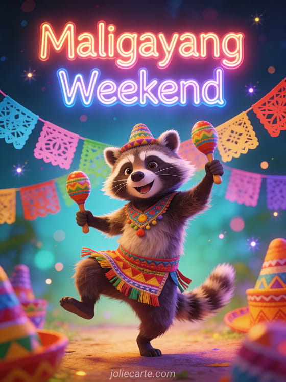 Magpadala ng masayang maligayang weekend na bati para magsimula ng weekend na may ngiti. Isang nakakatawang raccoon na sumasayaw na may maracas na napapalibutan ng makulay na mga dekorasyon ng fiesta at papel picado. Tuklasin din ang maligayang weekend na card na may hardin o ang nakakatawang weekend na card.