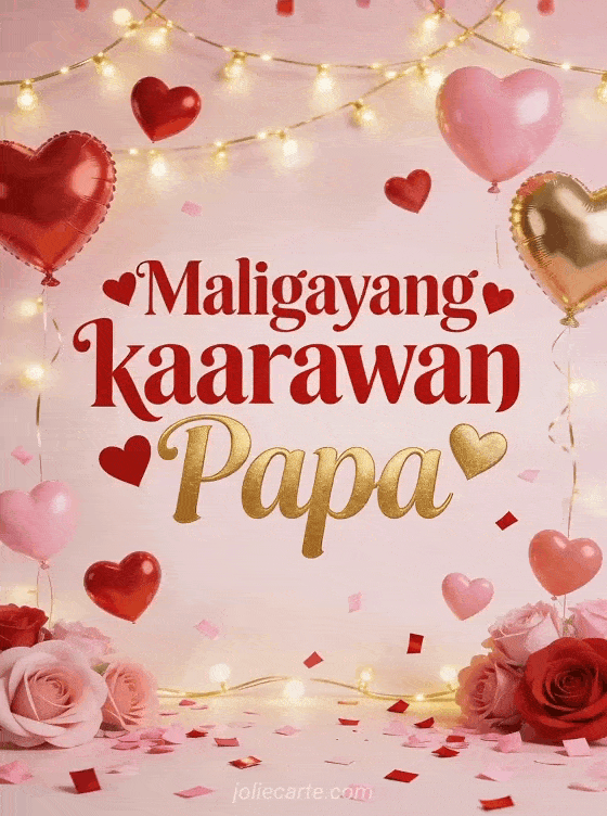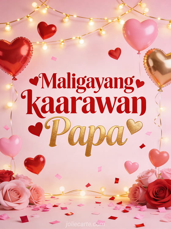 Ipagdiwang ang kaarawan ng iyong Papa gamit ang magandang libreng kard na ito. Pula at gintong letra na may mga puso, mga lobo na hugis puso, gintong garland at confetti. Tuklasin din ang kard ng maligayang kaarawan Papa na nakakatawa o ang kard ng maligayang kaarawan Papa na may teksto o ang kard ng kaarawan Papa na may drawing.