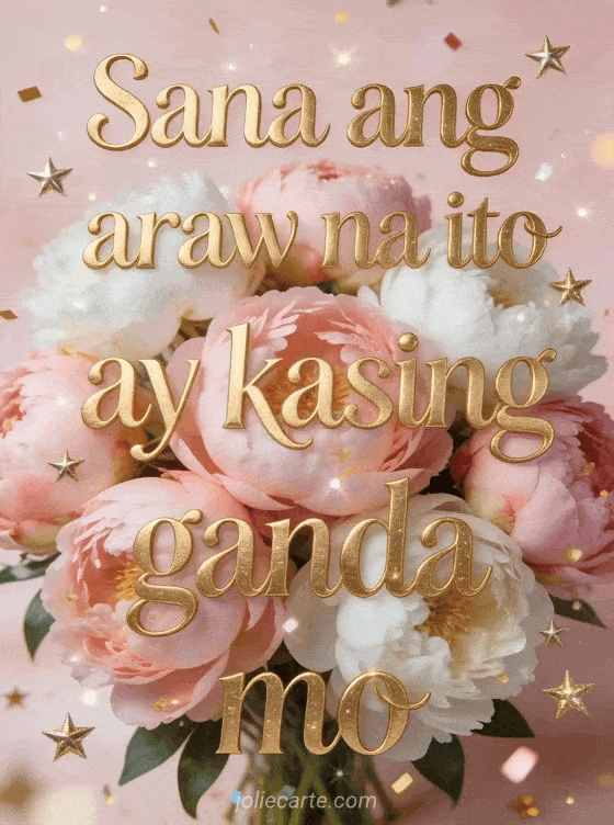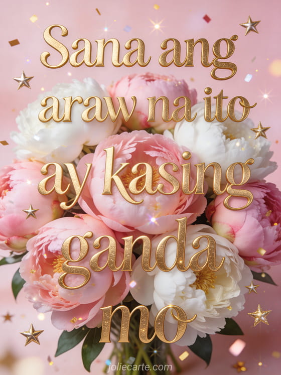 Ipagdiwang ang kaarawan ng kaibigan gamit ang masayang card na ito na may eleganteng gintong letra, magandang bulaklak na rosas at puting peony na napapaligiran ng gintong bituin at kumikislap na confetti sa rosas na background. Tuklasin din ang kaarawan card ng pagkakaibigan na may paglubog ng araw o isang kaarawan card na may liryo.