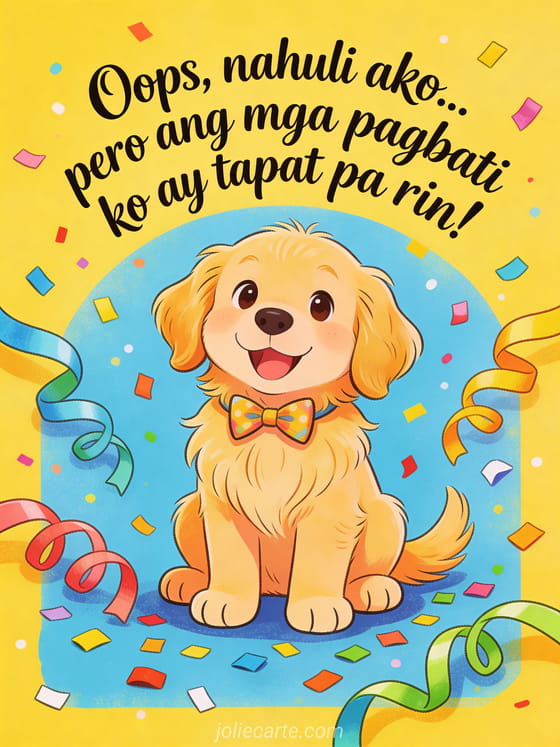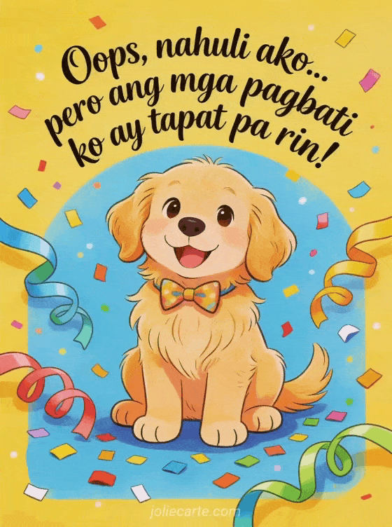 Humingi ng paumanhin sa pagkahuli gamit ang magandang kaarawan card na ito na puno ng humor. Isang cute na golden retriever na may bow tie ang nagpapadala ng tapat na pagbati. Tuklasin din ang kaarawan ecard o isang belated na kaarawan ecard.