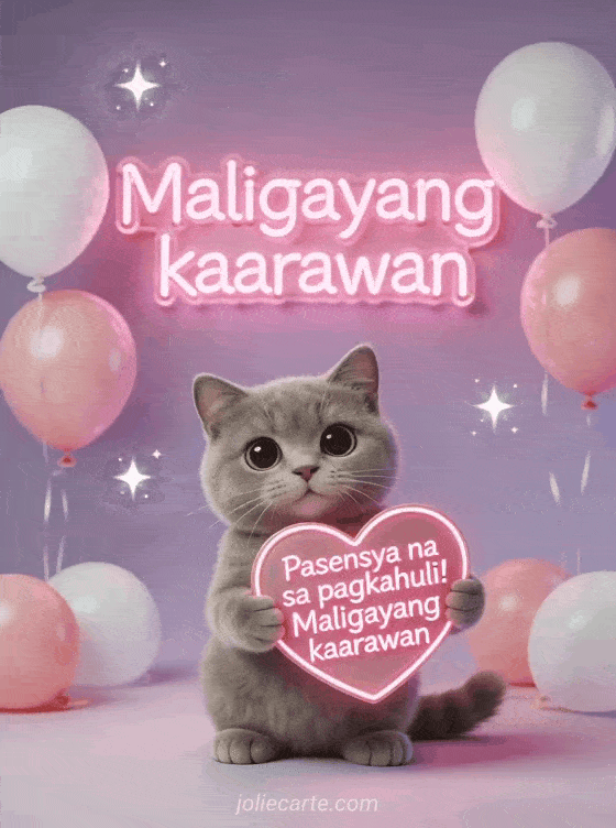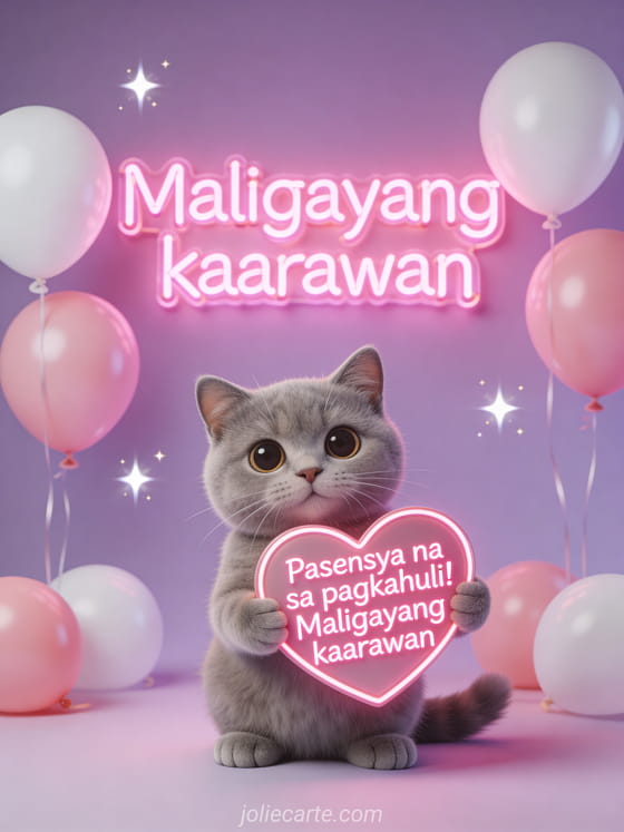 Humingi ng paumanhin sa pagkahuli gamit ang cute na kaarawan card na ito na may british shorthair na pusa, mga puso at mga lobo. Tuklasin din ang nakakatuwang belated na kaarawan card o isang kaarawan ecard.