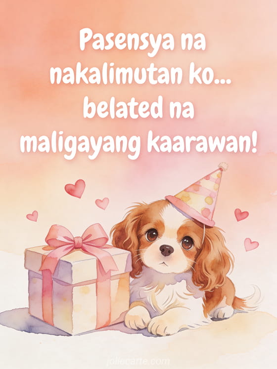 Humingi ng paumanhin sa pagkalimot gamit ang malambot na belated na kaarawan card na ito na may Cavalier King Charles, mga puso at regalo. Tuklasin din ang belated na kaarawan card na may pusa o isang belated na kaarawan card na may bulaklak.