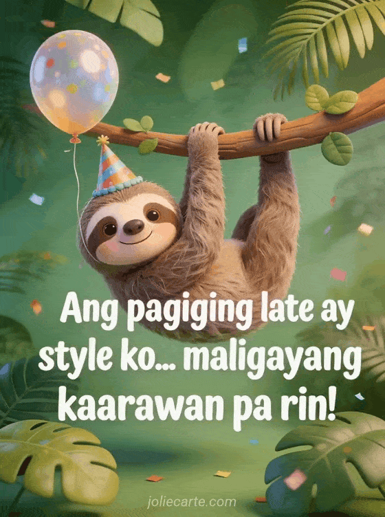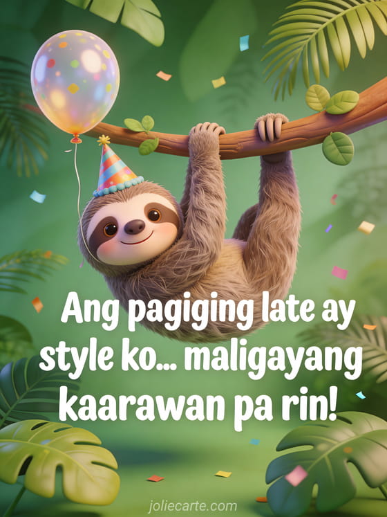 Ang pagiging late ay style ko! Magpadala ng nakakatuwang belated na kaarawan card na ito na may masayang sloth at mga lobo. Tuklasin din ang belated na kaarawan card na may aso o isang belated na kaarawan card na may pusa.