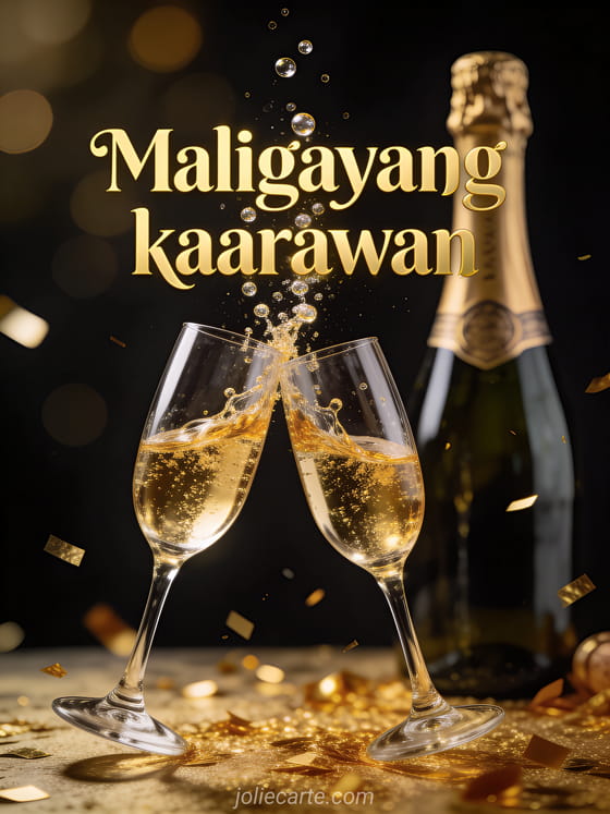 Magpadala ng eleganteng maligayang kaarawan card para sa lalaki na may gintong letra at mga bula ng champagne, dalawang kristal na copa na nag-tobrindis na may gintong splash, isang vintage na bote, at gintong confetti na bumabagsak. Tuklasin din ang animated na kaarawan card para sa lalaki o ang kaarawan card para sa lalaki.