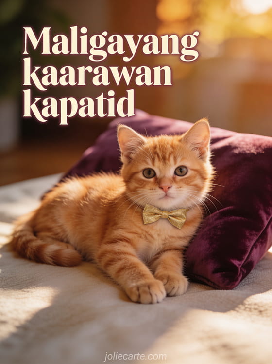 Ipagdiwang ang kaarawan ng iyong kapatid gamit ang adorable na libreng kard na ito. Isang cute na pulang pusa na nakahiga sa velvet cushion na may gintong bow tie, malambing na nakatingin sa iyo sa mainit na hapon na liwanag. Tuklasin din ang kard ng kaarawan kapatid mensahe o ang kard ng kaarawan kapatid o ang kard ng kaarawan kapatid humor.