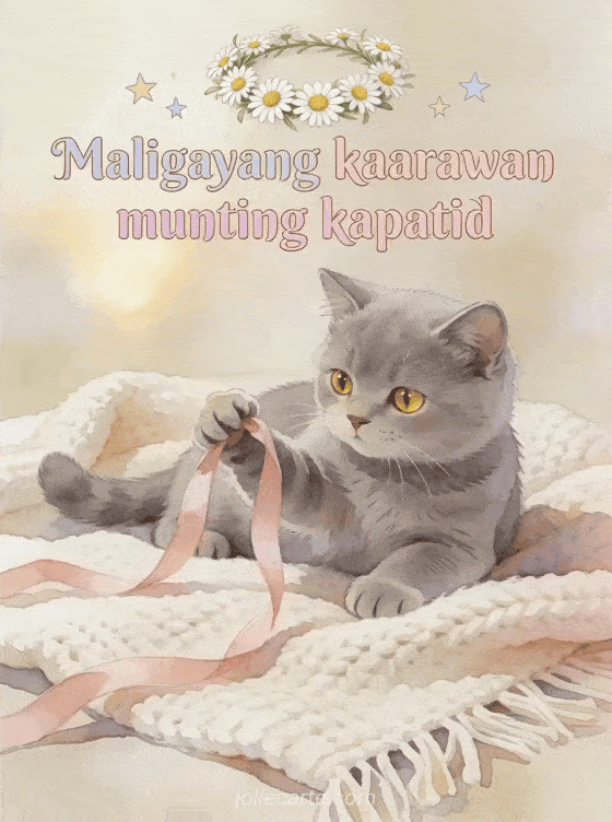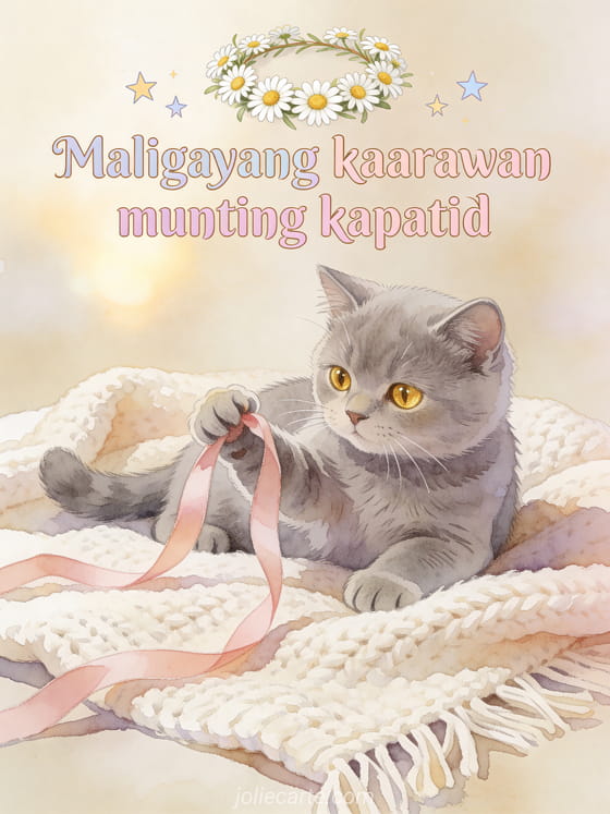 Ipagdiwang ang kaarawan ng iyong munting kapatid gamit ang adorable na libreng kard na ito. Isang cute na gray na British Shorthair kitten na may gintong mga mata na naglalaro ng rosas na ribbon sa malambot na wool plaid, isang maliit na korona ng bulaklak ng camomile sa tabi. Tuklasin din ang kard ng kaarawan kapatid o ang kard ng kaarawan kapatid o ang kard ng kaarawan kapatid humor.