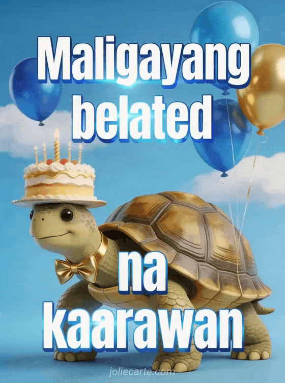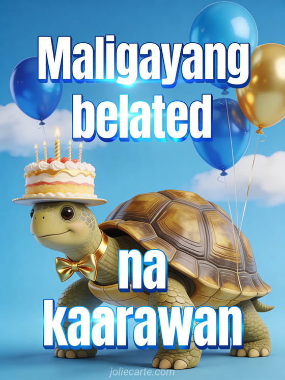 Ipadala ang nakakatuwang belated na pagbati ng kaarawan na ito na may adorable na pagong na may dala-dalang birthday cake upang ipakita na sulit ang paghihintay. Tuklasin din ang makulay na belated na kaarawan o ang nakakatawang belated na kaarawan o ang SMS ng belated na kaarawan.