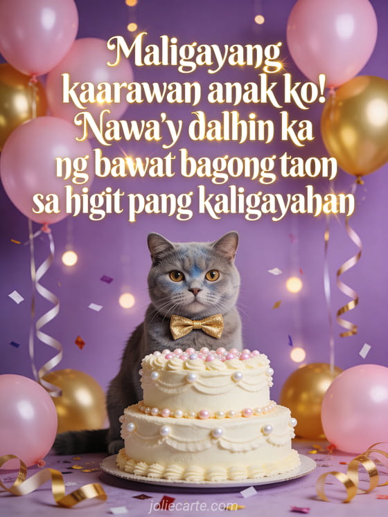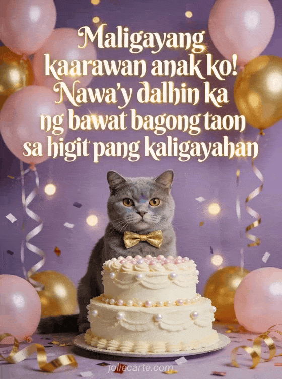 Nawa'y dalhin ka ng bawat bagong taon sa higit pang kaligayahan. Magpadala ng masayang kaarawan card na ito sa iyong anak na babae na may British Shorthair na pusa, cake at mga lobo. Tuklasin din ang kaarawan card para sa anak na babae o isang kaarawan tula card para sa anak na babae.