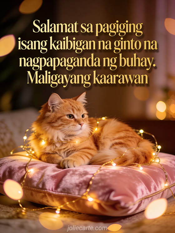 Ipagdiwang ang kaarawan ng kaibigan gamit ang malambing na card na ito na may pulang pusa na nakahiga sa rosas na velvet na unan na napapaligiran ng gintong garland, sa mainit at malapit na kapaligiran. Tuklasin din ang kaarawan card para sa kaibigan o isang kaarawan card ng pagkakaibigan na may bulaklak.
