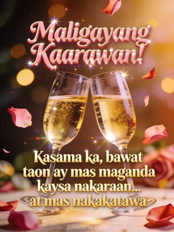 Magpadala ng masayang pagbati ng kaarawan para ipagdiwang ang espesyal na araw na ito nang may elegansya at humor. Ang card na ito ay nagpapaalala na bawat taon na magkasama ay lalong bumubuti. Tuklasin din ang nakakatawang pagbati ng kaarawan na may humor.