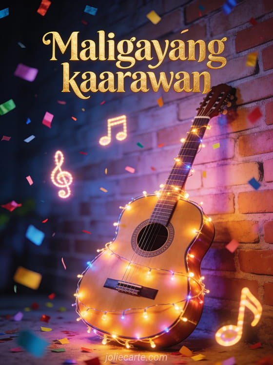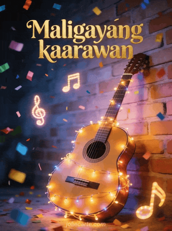 Magpadala ng masayang maligayang kaarawan card na may gintong letra at makukulay na confetti, isang acoustic guitar na may mga ilaw laban sa pader ng bato, at maliwanag na nota ng musika na lumulutang sa hangin. Tuklasin din ang musikal na kaarawan card na may piano o ang animated na kaarawan card na may music box.