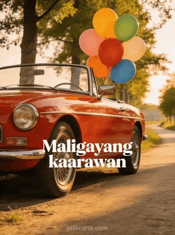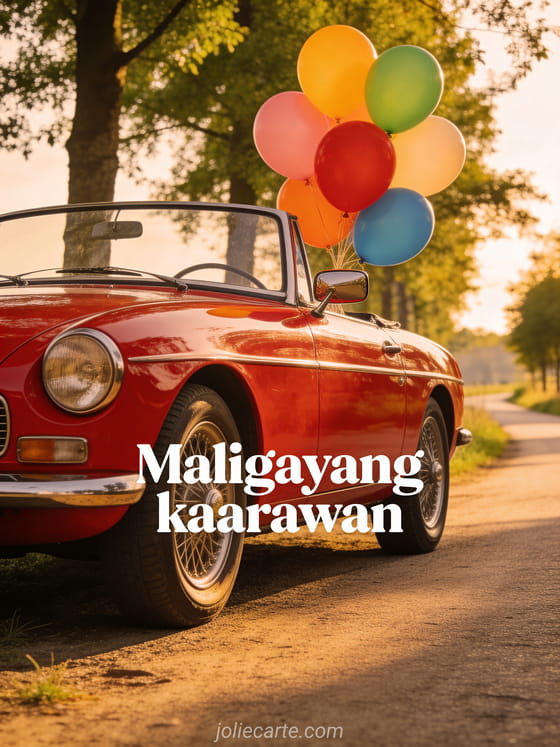 Magpadala ng magandang maligayang kaarawan card na may kahanga-hangang klasikong pulang convertible na naka-park sa isang daan sa kanayunan na nalilinyang ng mga puno, na may mga makukulay na lobo na nakatali sa salamin, naliligo sa gintong liwanag. Tuklasin din ang kaarawan ecard para sa grupo.