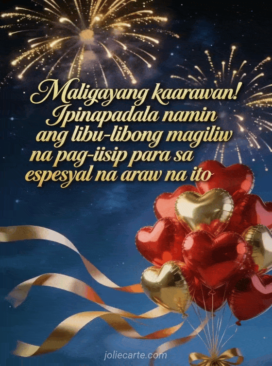 Ipagdiwang ang isang kaarawan gamit ang maringal na libreng kard na ito. Mga lobo na hugis puso pula at ginto na may magandang ribbon, gintong paputok na nag-iilaw sa langit na puno ng bituin, sa isang masaya at maringal na kapaligiran.