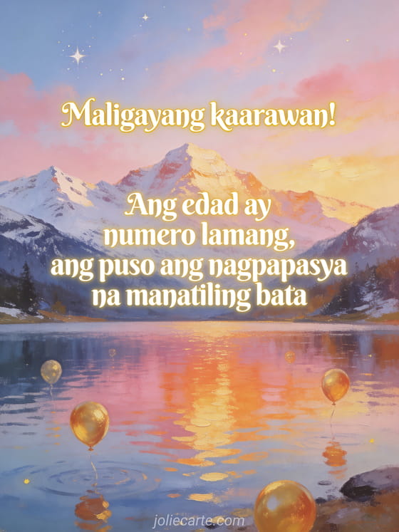 Ipagdiwang ang isang kaarawan gamit ang nakapagbibigay-inspirasyong sipi tungkol sa pagiging bata sa puso. Tuklasin din ang isang sipi tungkol sa panahong lumilipas sa kaarawan, isang magandang kaarawan ecard o isang minimalist na kaarawan ecard.