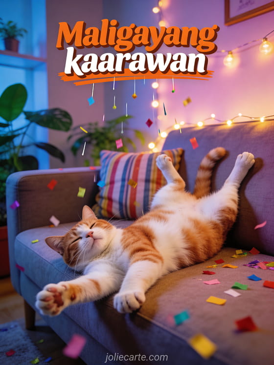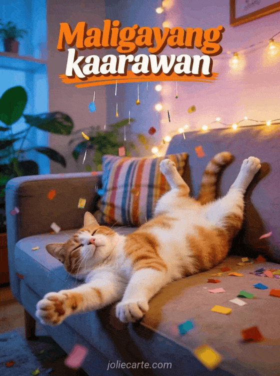 Magpadala ng nakakatuwang birthday card na may fotorealistikong ginger cat na nakahiga sa sofa na ganap na relaxed na may confetti na bumabagsak. Tuklasin din ang neon na birthday card na may pusa o isang glamorous na birthday card na may pusa.