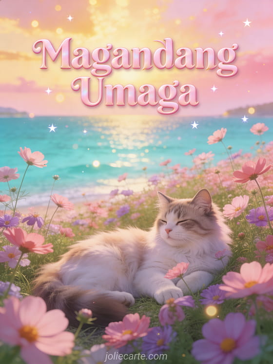 Magpadala ng malambot na Magandang Umaga na bati na may malambot na Siberian na pusa sa gitna ng cosmos bulaklak sa tabi ng turkesa na paraiso na look. Tuklasin din ang isang Magandang Umaga na may pahayag card o isang Magandang Umaga Oktubre card.