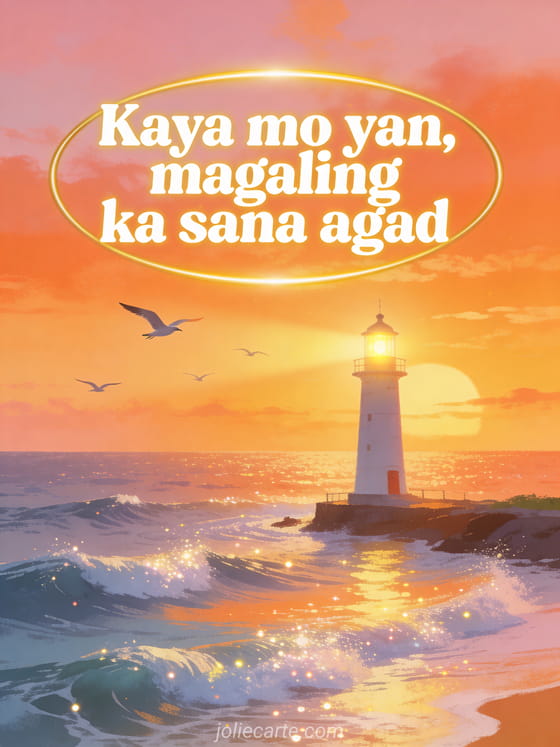 Magpadala ng nakapag-iinspirang card gamit ang mensaheng Kaya mo yan, magaling ka sana agad sa isang minamahal. Tuklasin din ang isang card ng tapang at paggaling, isang card ng tapang at pagpapagaling o isang magandang card ng pagpapagaling.