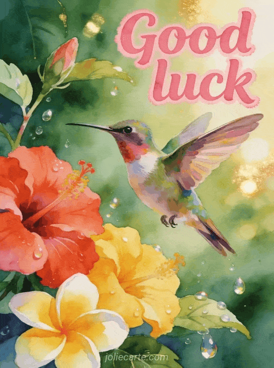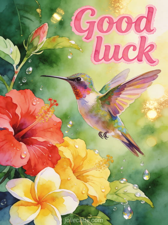 Batiin ng good luck ang isang tao gamit ang makulay na card na ito. Isang hummingbird na may makukulay na balahibo na lumilipad sa harap ng mga tropical na bulaklak kasama ang pulang hibiscus at dilaw na frangipani, na may kumikinang na mga patak ng tubig at gintong liwanag.