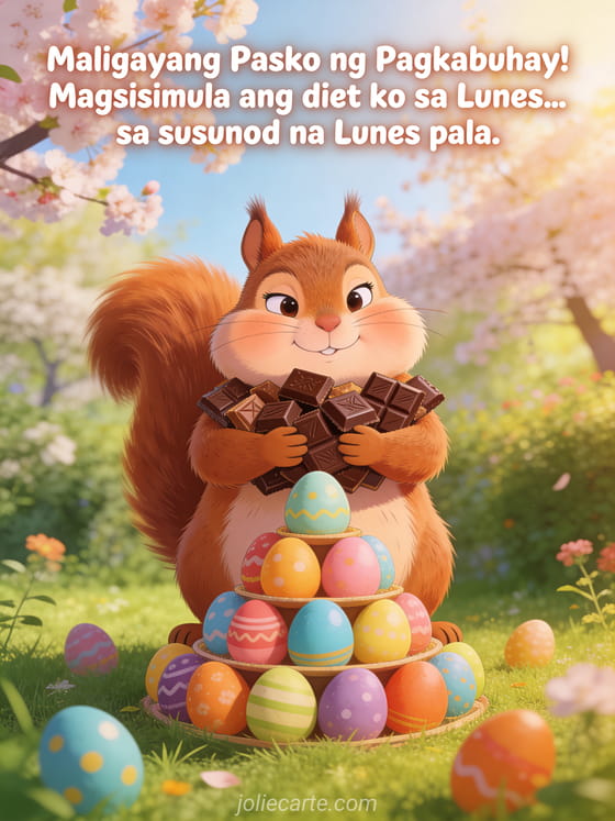 Magbahagi ng magandang tawanan ngayong Pasko ng Pagkabuhay gamit ang nakakatawang card tungkol sa tukso ng tsokolate. Tuklasin din ang nakakatawang weekend ng Pasko ng Pagkabuhay, humor ng Pasko ng Pagkabuhay o nakakatawang card ng Pasko ng Pagkabuhay.