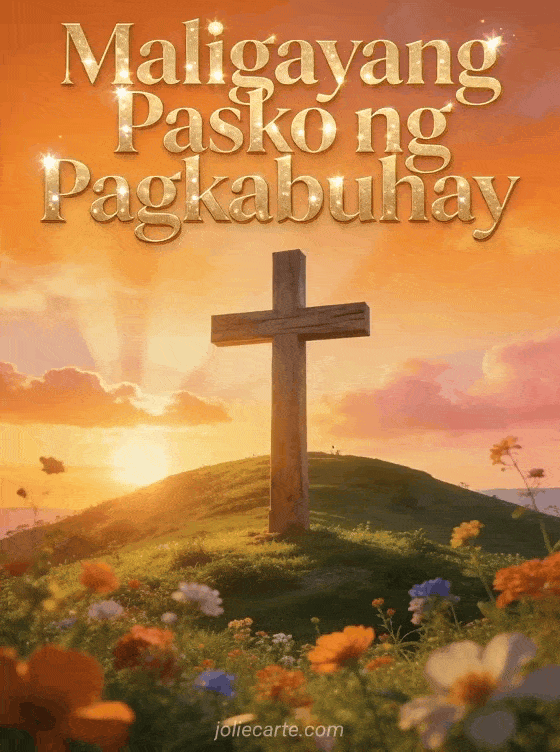 Ipagdiwang ang kagalakan ng Pasko ng Pagkabuhay sa pamamagitan ng magandang relihiyosong card na ito na may krus sa paglubog ng araw. Isang makabuluhan at libreng paraan para bumati ng maligayang Pasko ng Pagkabuhay.