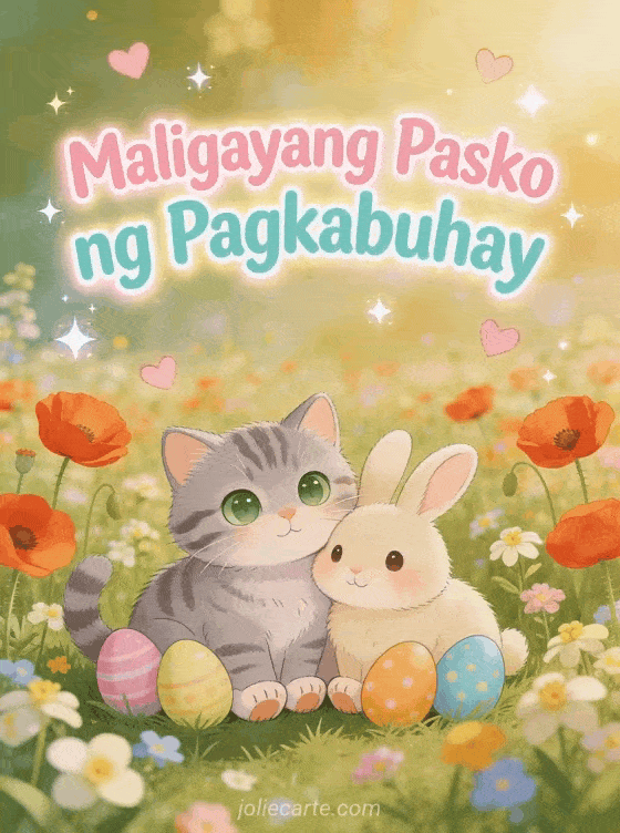 Pasayahin ang mga maliliit gamit ang kaibig-ibig na card na ito ng Maligayang Pasko ng Pagkabuhay na may tabby na pusa at kuneho na magkayakap sa taniman ng poppy at daisy, napapaligiran ng mga makukulay na itlog ng Pasko ng Pagkabuhay. Isang kawaii na ilustrasyon na puno ng kagalakan at pagmamahal. Tuklasin din ang card ng mga hayop ng Pasko ng Pagkabuhay o isang video card ng kuneho ng Pasko ng Pagkabuhay.