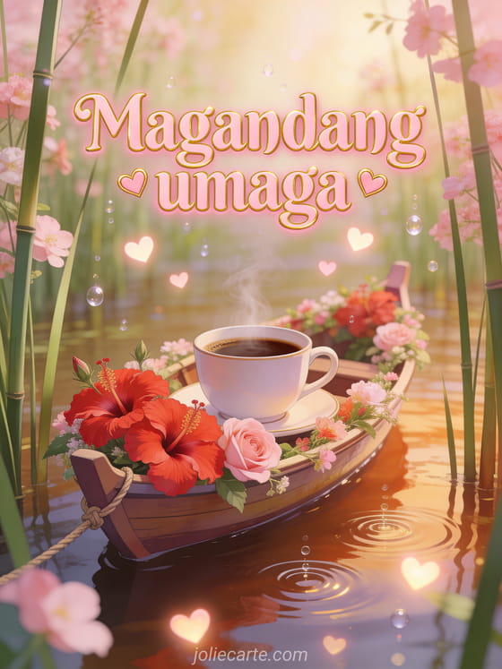 Magpadala ng mainit na magandang umaga sa pamamagitan ng poetikong coffee card na ito. Isang umuusok na tasa ng kape ang nasa isang bangkang puno ng bulaklak na nakatali sa mga tambo, na may matingkad na pula at rosas na hibiscus, mahinang ambon ng tagsibol at kumikinang na mga puso na lumulutang sa itaas. Tuklasin din ang magandang umaga coffee card sa dagat, ang magandang umaga halik coffee card o ang namimiss kita card.